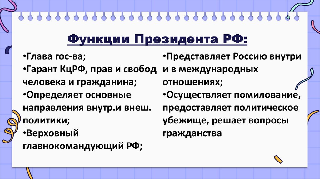 Функции Президента РФ:•Глава гос-ва;