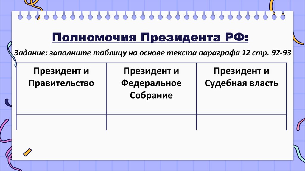 Полномочия Президента РФ:Задание: заполните таблицу на основе текста параграфа 12 стр. 92-93