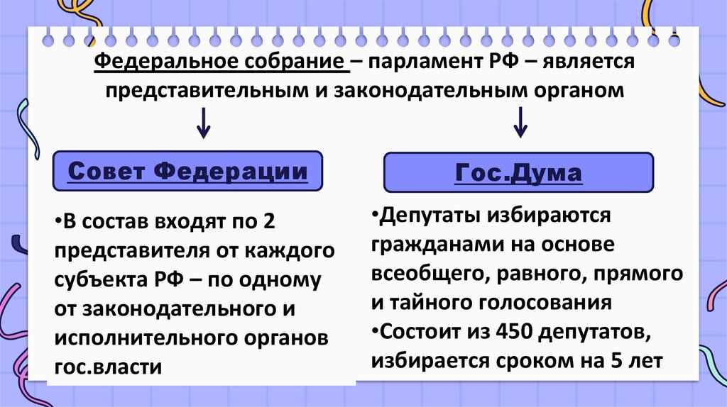 Федеральное собрание – парламент РФ – являетсяпредставительным и законодательным органом