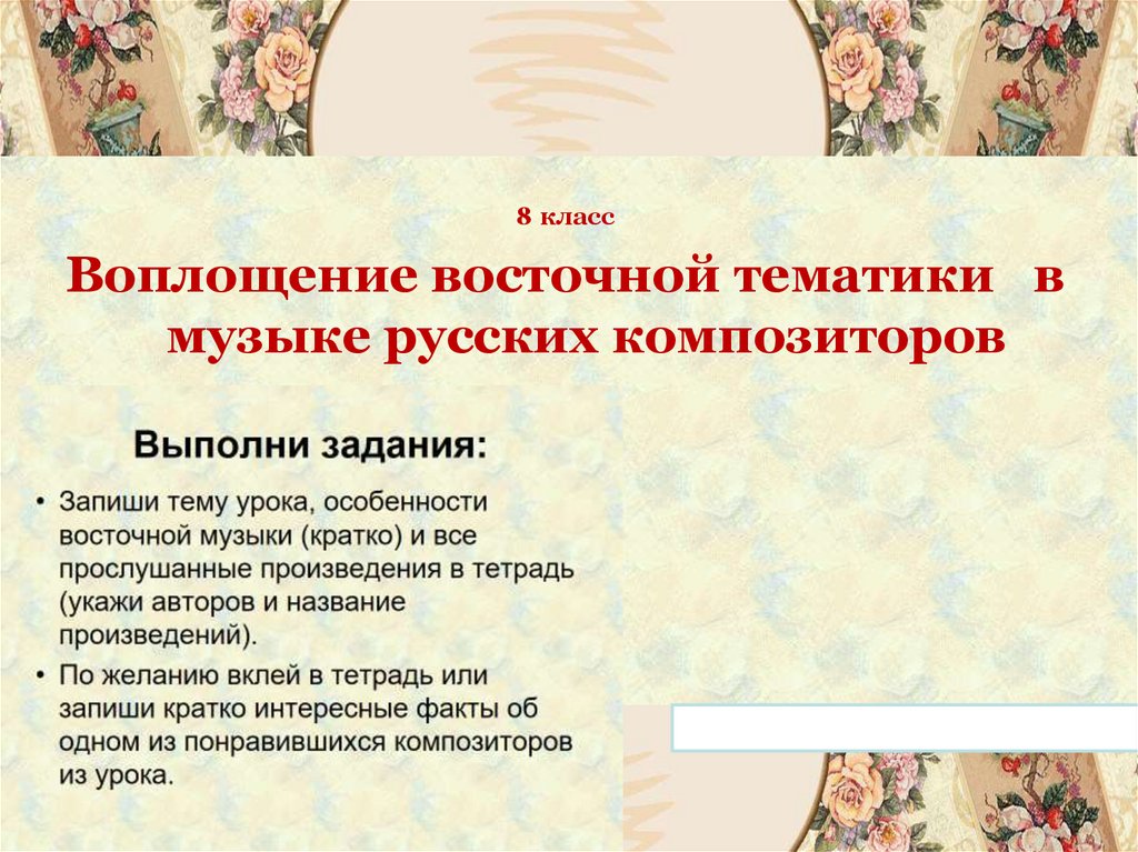• Запиши тему урока, особенности восточноймузыки (кратко) и все прослушанные