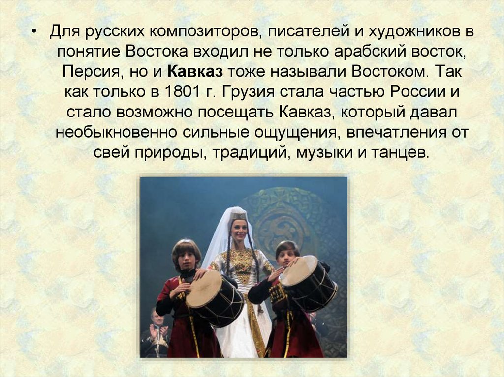 • Для русских композиторов, писателей и художников впонятие Востока входил не только арабский восток,