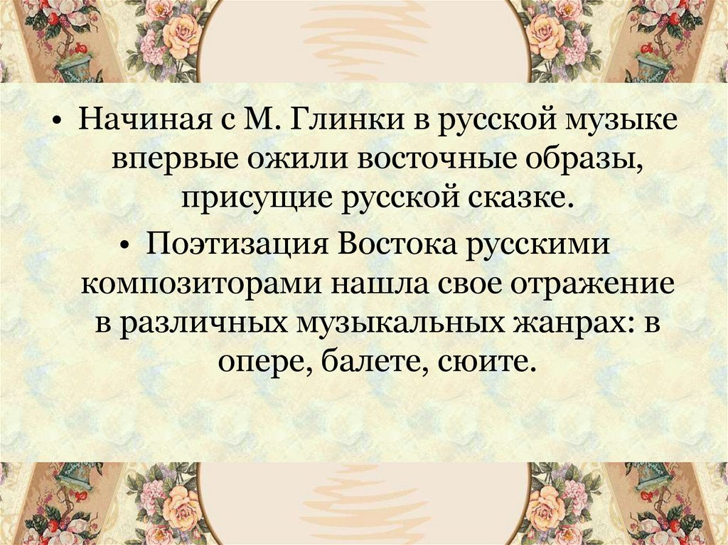 • Начиная с М. Глинки в русской музыкевпервые ожили восточные образы,