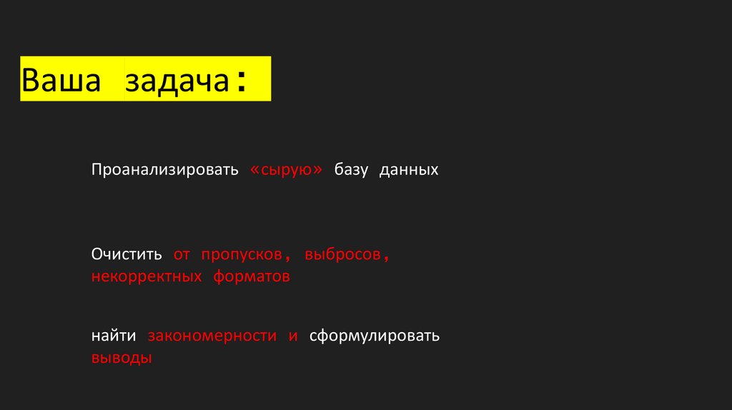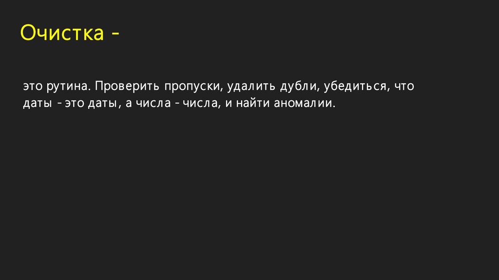 Очистка это рутина. Проверить пропуски, удал ить дубл и, убедить ся, чтодаты - это даты , а числ а - числ а, и найти аномал ии.