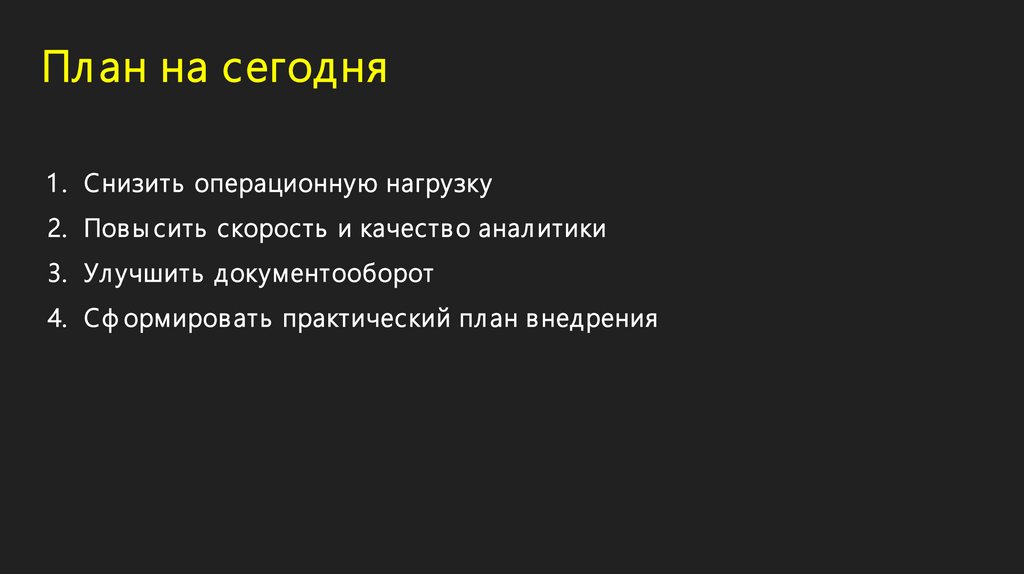 Пл ан на сегодня1 . Снизить операционную нагрузку