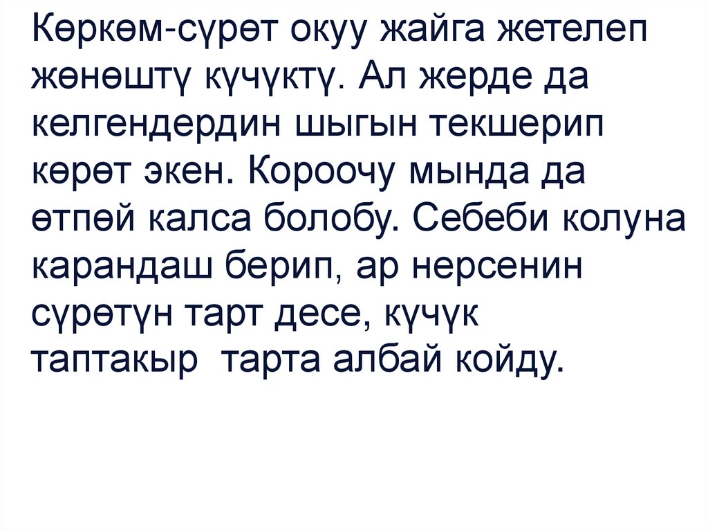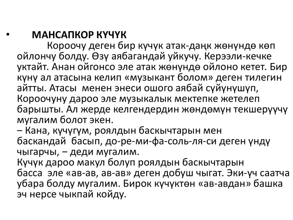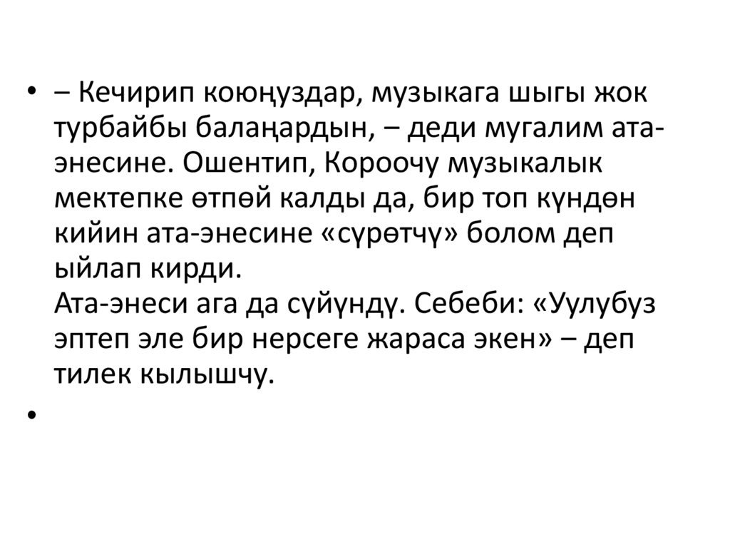 • ‒ Кечирип коюңуздар, музыкага шыгы жоктурбайбы балаңардын, ‒ деди мугалим атаэнесине. Ошентип, Короочу музыкалык