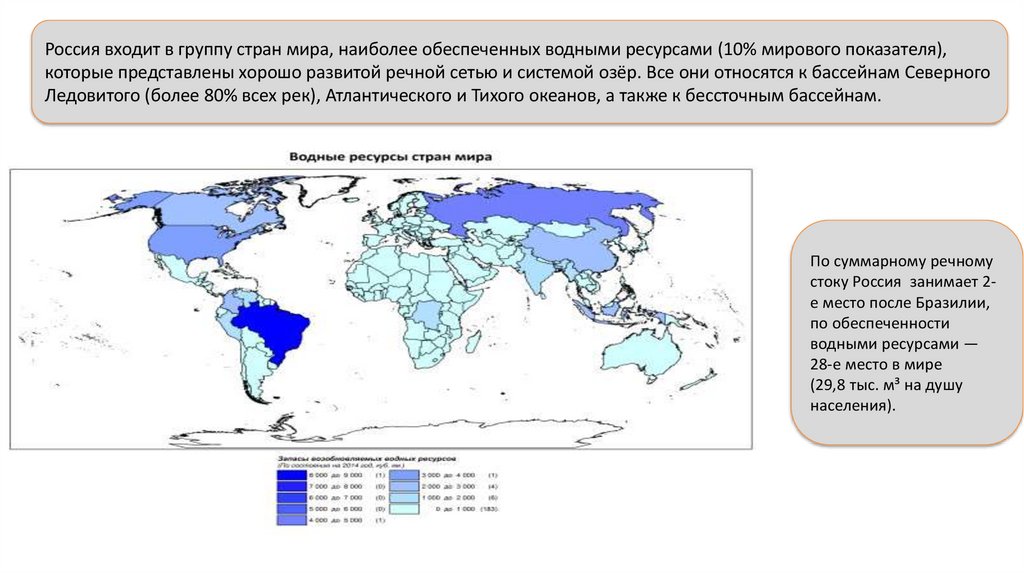 Россия входит в группу стран мира, наиболее обеспеченных водными ресурсами (10% мирового показателя),которые представлены хорошо развитой речной сетью и системой озёр. Все они относятся к бассейнам Северного