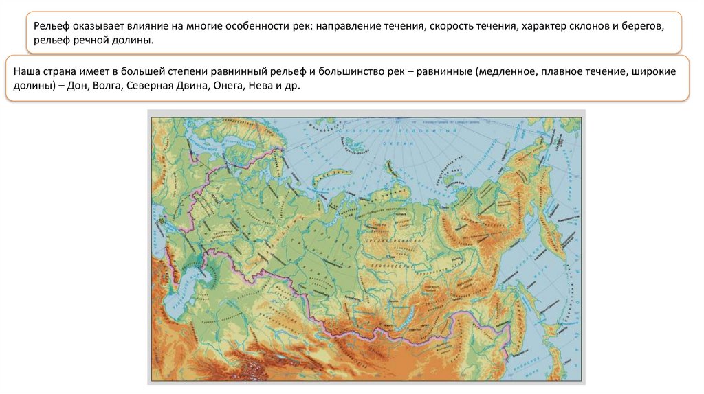Рельеф оказывает влияние на многие особенности рек: направление течения, скорость течения, характер склонов и берегов,рельеф речной долины.