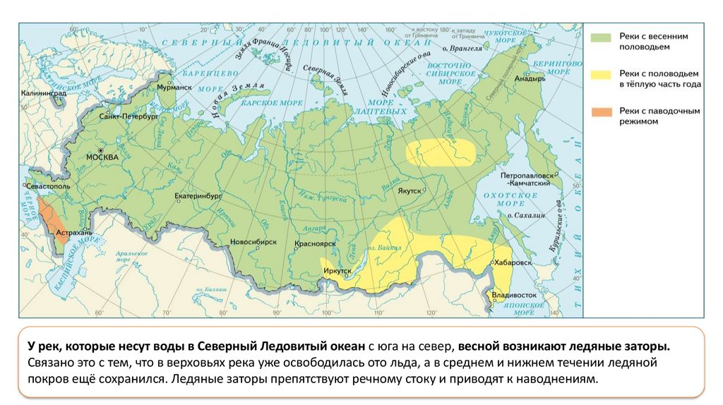У рек, которые несут воды в Северный Ледовитый океан с юга на север, весной возникают ледяные заторы.Связано это с тем, что в верховьях река уже освободилась ото льда, а в среднем и нижнем течении ледяной