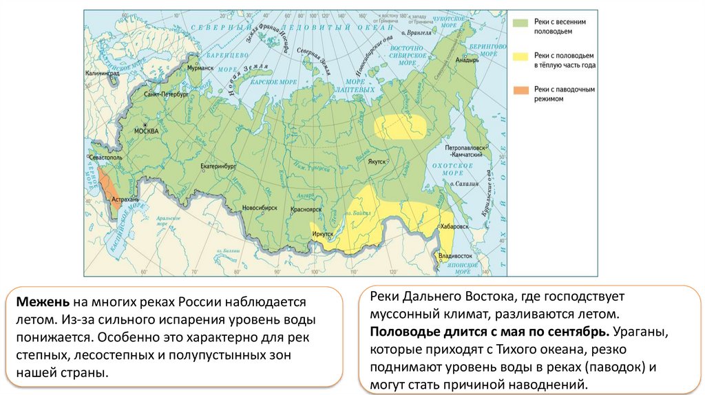 Климатические условия и основные типы питания влияют на режим рек – сезонное изменение стока.Ледостав — характерная черта почти всех рек России. Продолжительность его зависит от продолжительности и