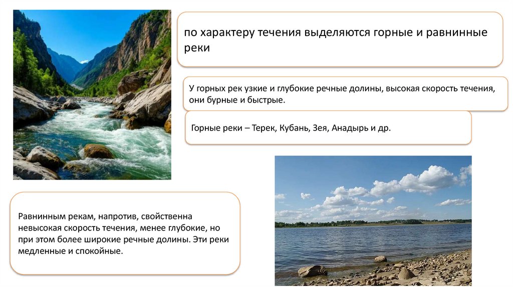 по характеру течения выделяются горные и равнинныереки