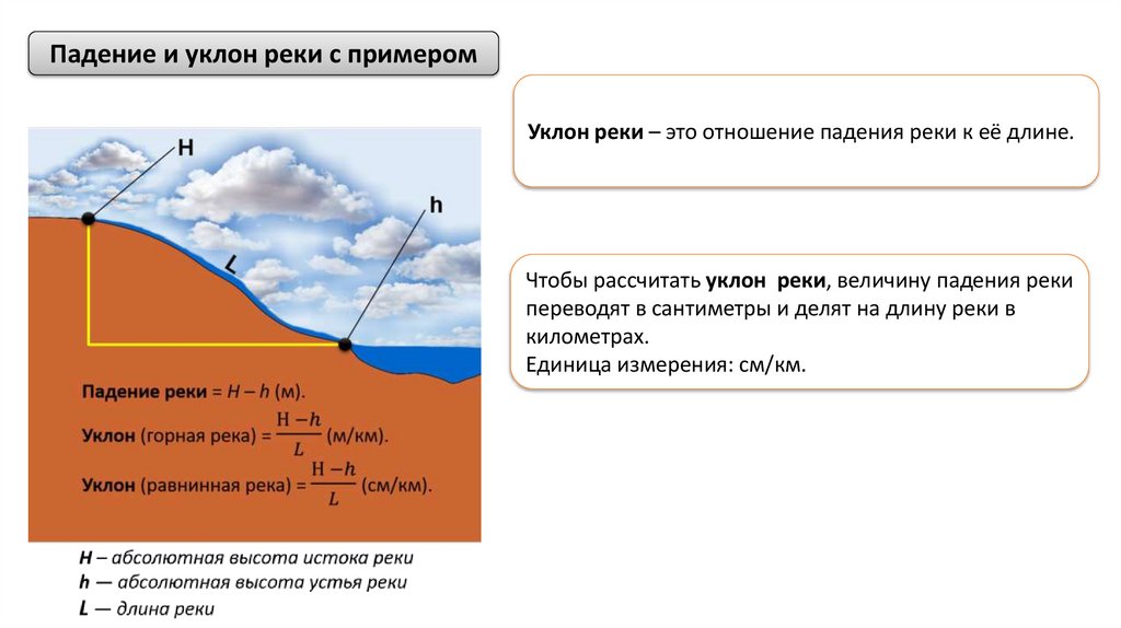 Падение и уклон реки с примеромУклон реки – это отношение падения реки к её длине.