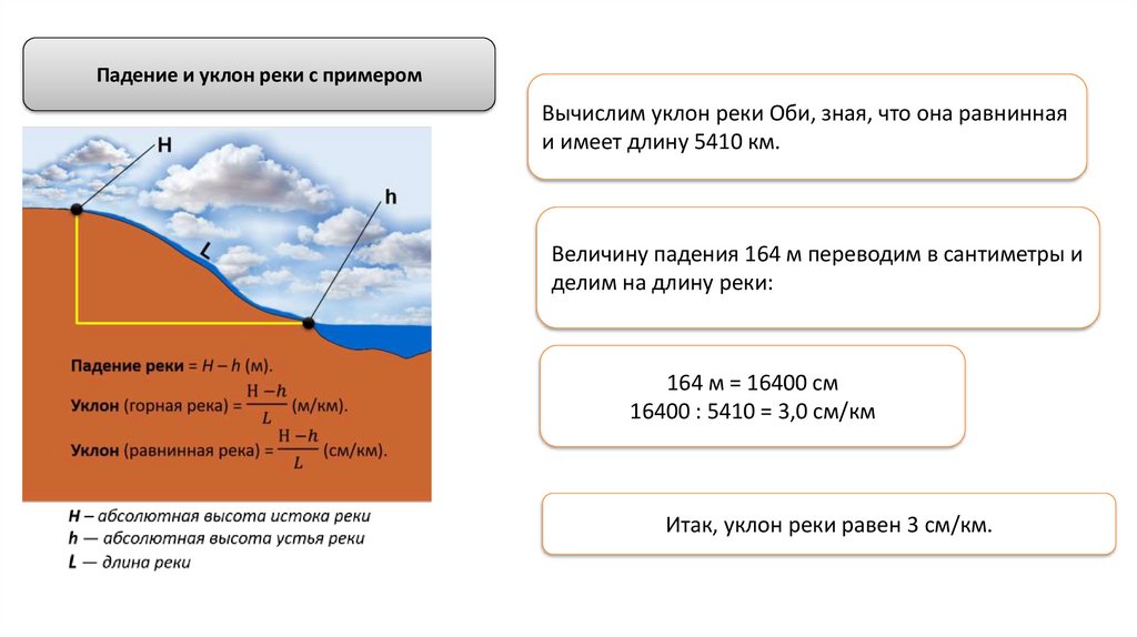Падение и уклон реки с примеромВычислим уклон реки Оби, зная, что она равнинная