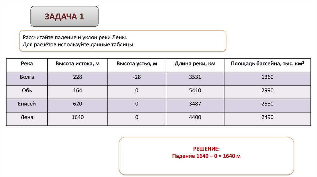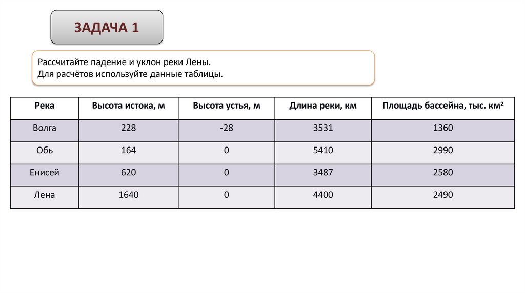 ЗАДАЧА 1Рассчитайте падение и уклон реки Лены.