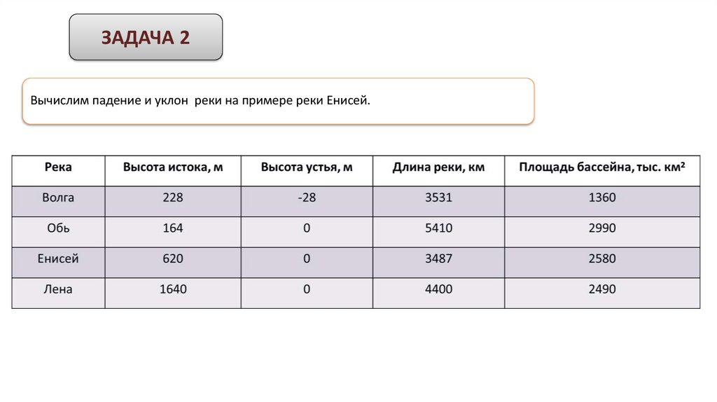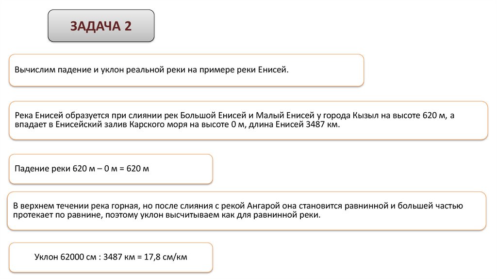 ЗАДАЧА 2Вычислим падение и уклон реки на примере реки Енисей.