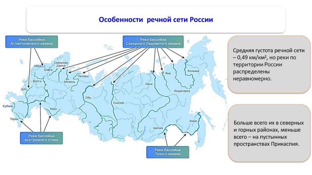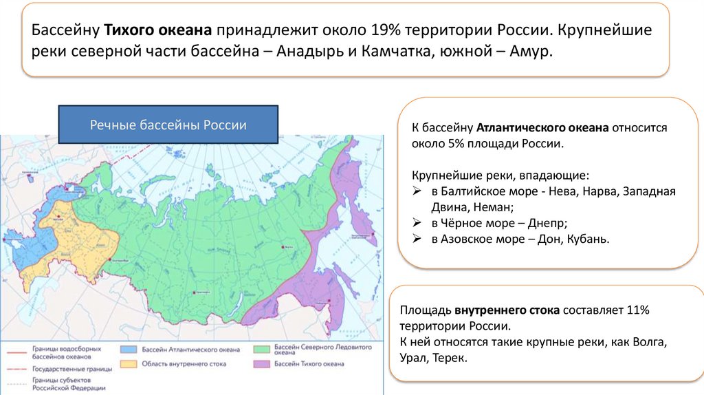 Ледовитого (более 80% всех рек), Атлантического и Тихого океанов, а также к бессточным бассейнам.
