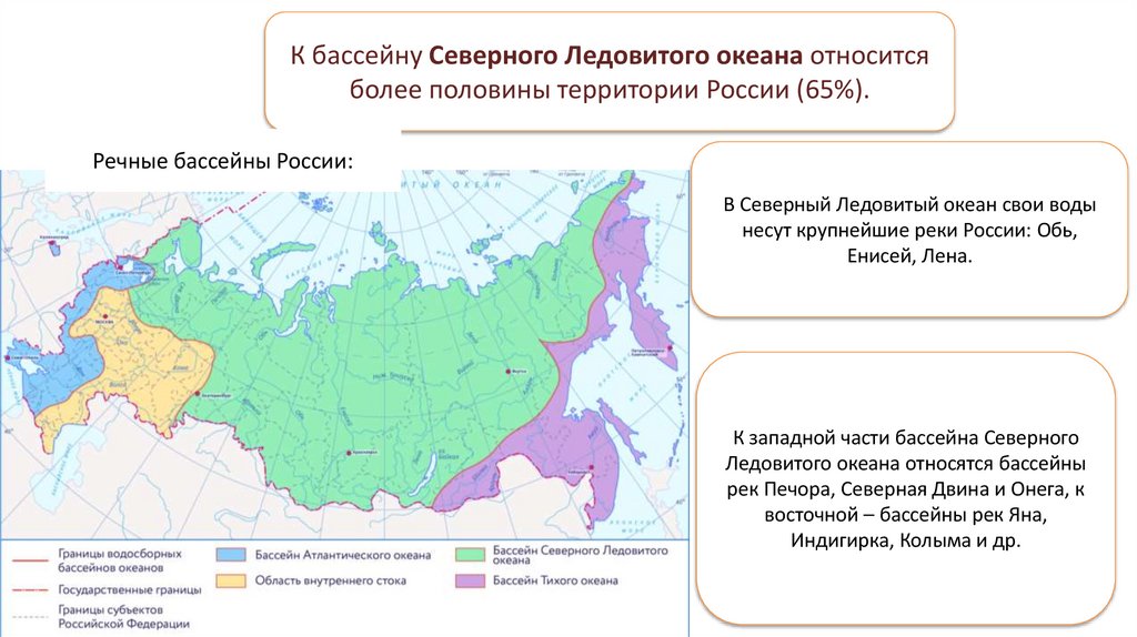 К бассейну Северного Ледовитого океана относитсяболее половины территории России (65%).