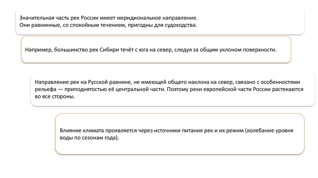Значительная часть рек России имеет меридиональное направление.Они равнинные, со спокойным течением, пригодны для судоходства.