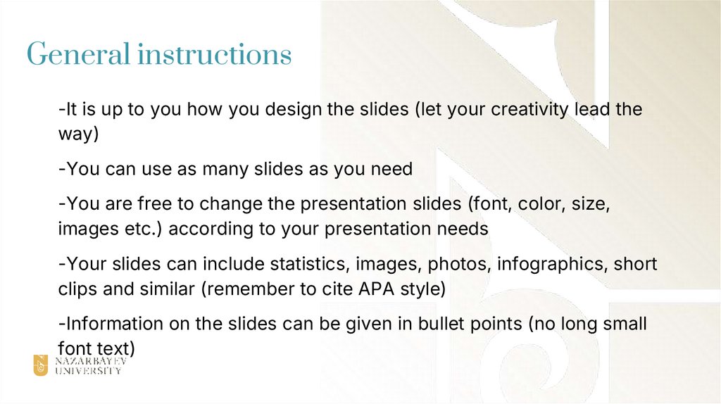 General instructions-It is up to you how you design the slides (let your creativity lead the