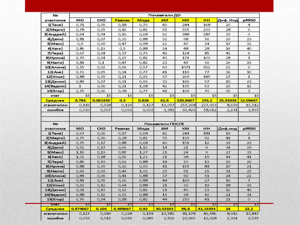 54. Во вводную таблицу необходимо ввести количество с ваготонией до (2 человека) и после (11 человек) и не имеющих этого признака