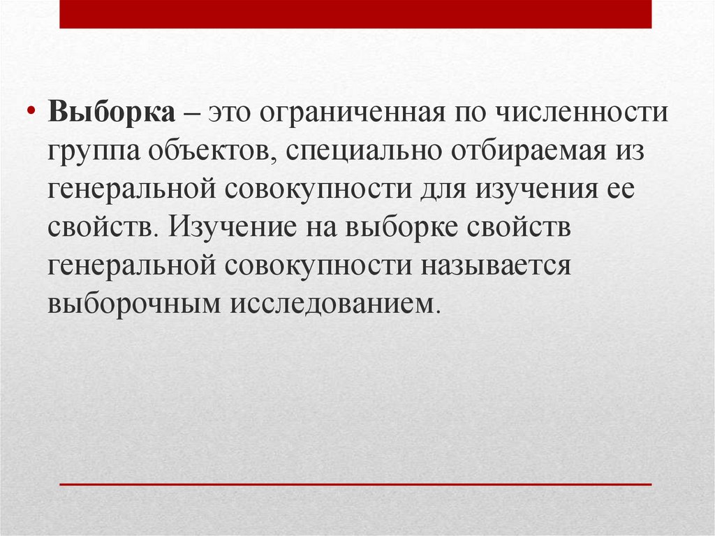 • Выборка – это ограниченная по численностигруппа объектов, специально отбираемая из