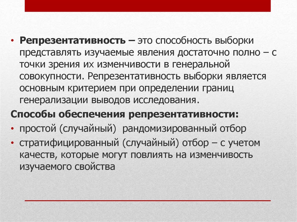 • Репрезентативность – это способность выборкипредставлять изучаемые явления достаточно полно – с