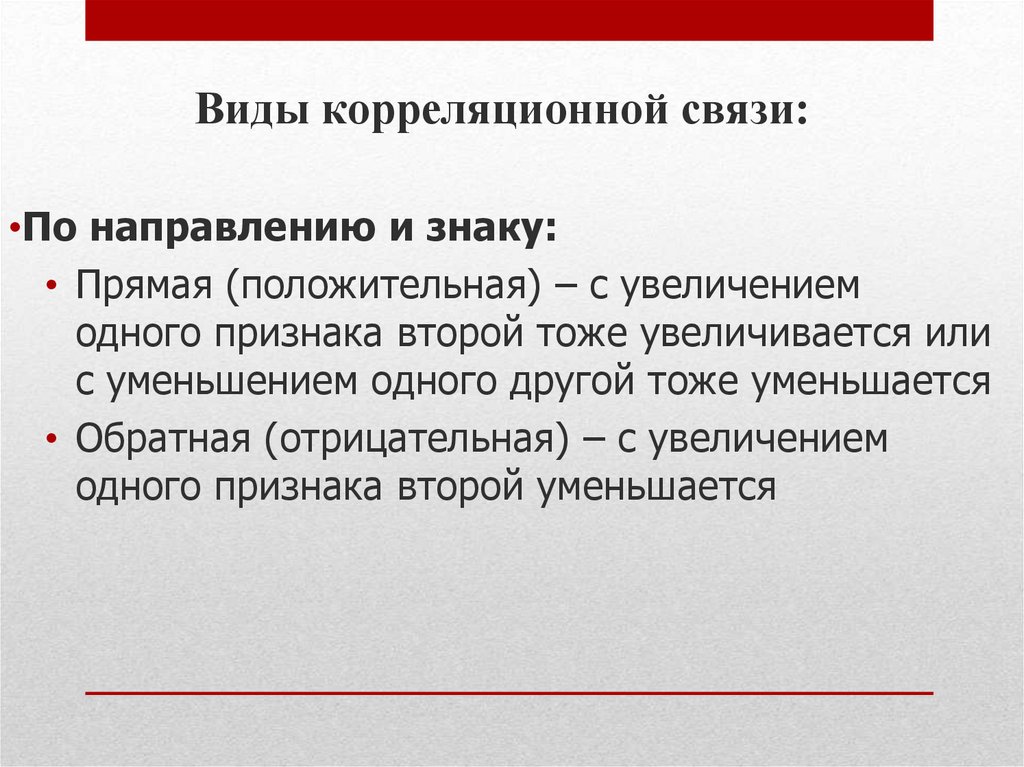 Виды корреляционной связи:•По направлению и знаку: