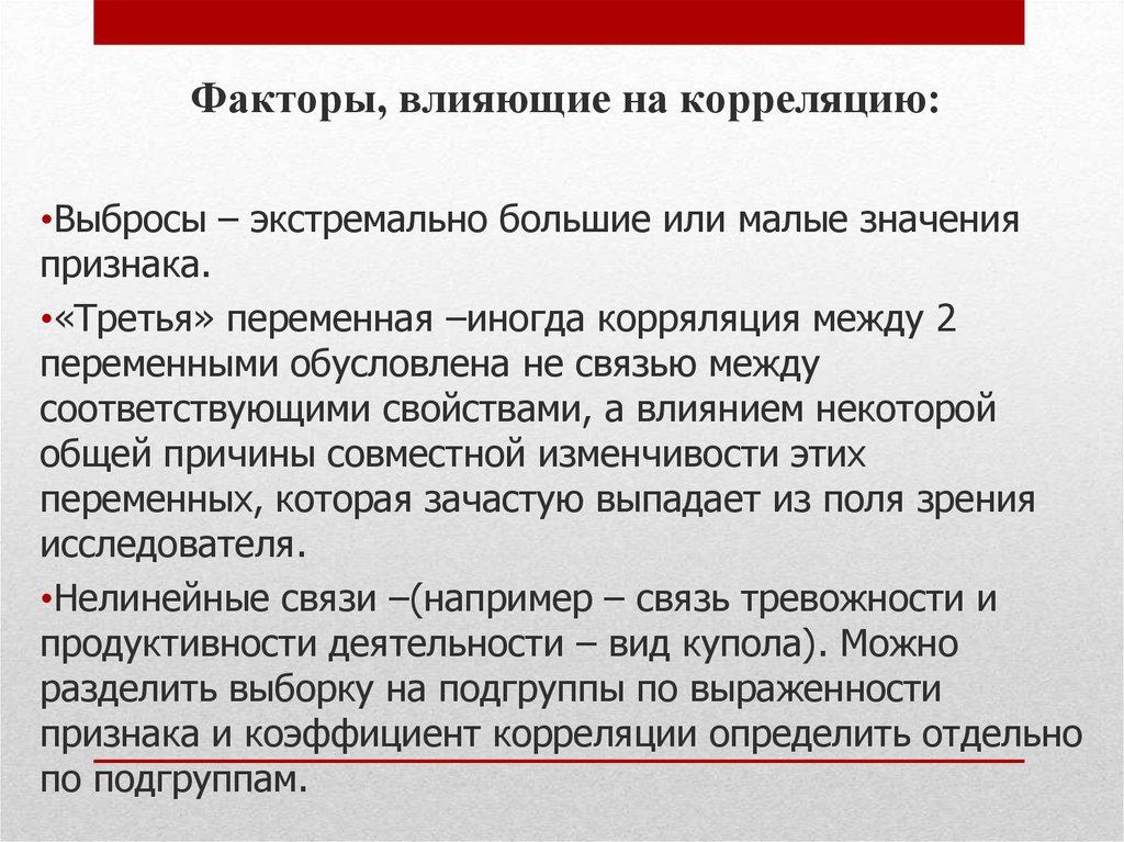 Факторы, влияющие на корреляцию:•Выбросы – экстремально большие или малые значения