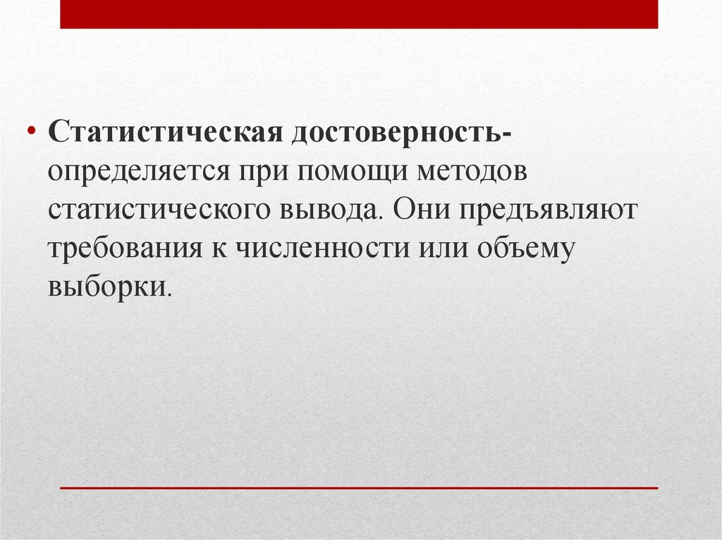 • Статистическая достоверностьопределяется при помощи методовстатистического вывода. Они предъявляют