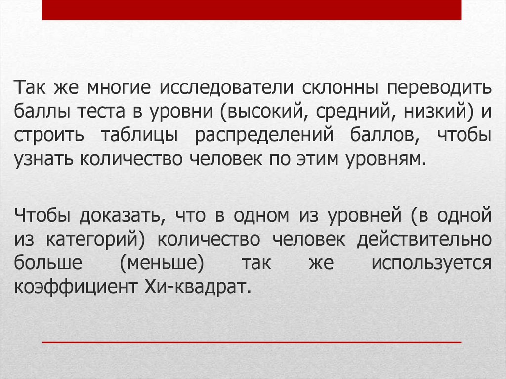 Так же многие исследователи склонны переводитьбаллы теста в уровни (высокий, средний, низкий) и