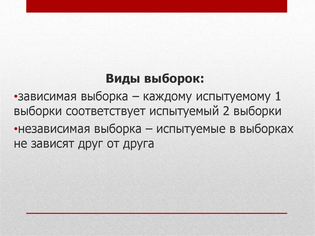Виды выборок:•зависимая выборка – каждому испытуемому 1