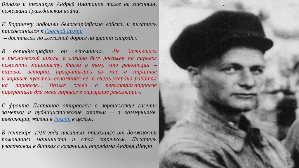 Однако и техникум Андрей Платонов тоже не закончил:помешала Гражданская война.