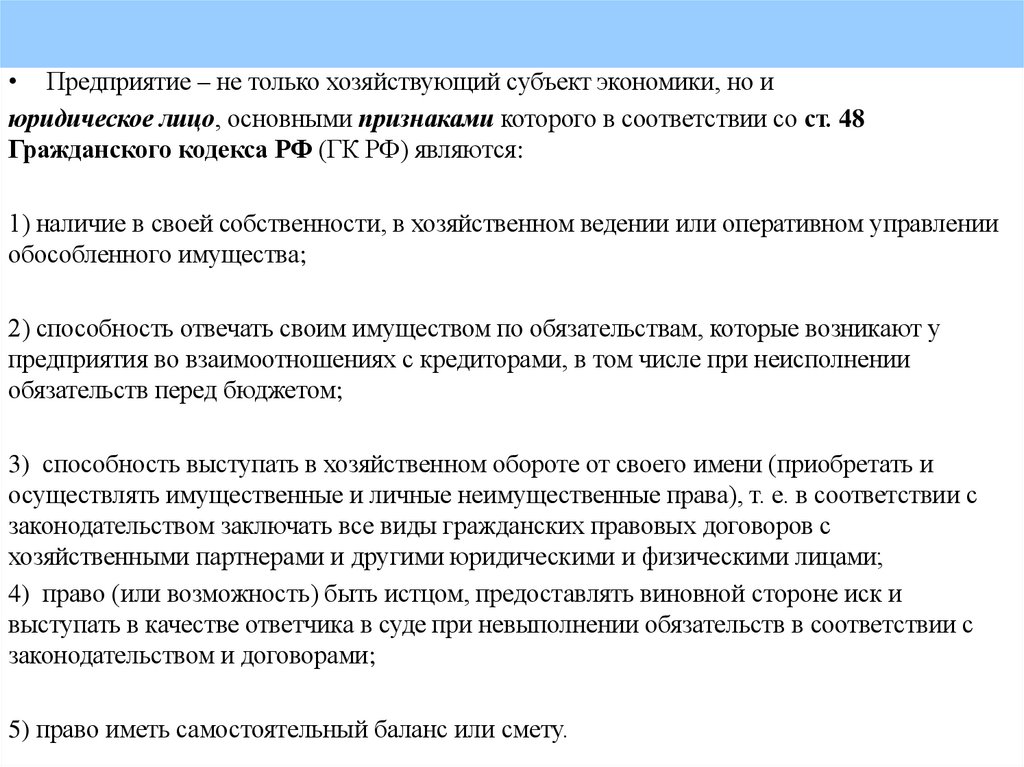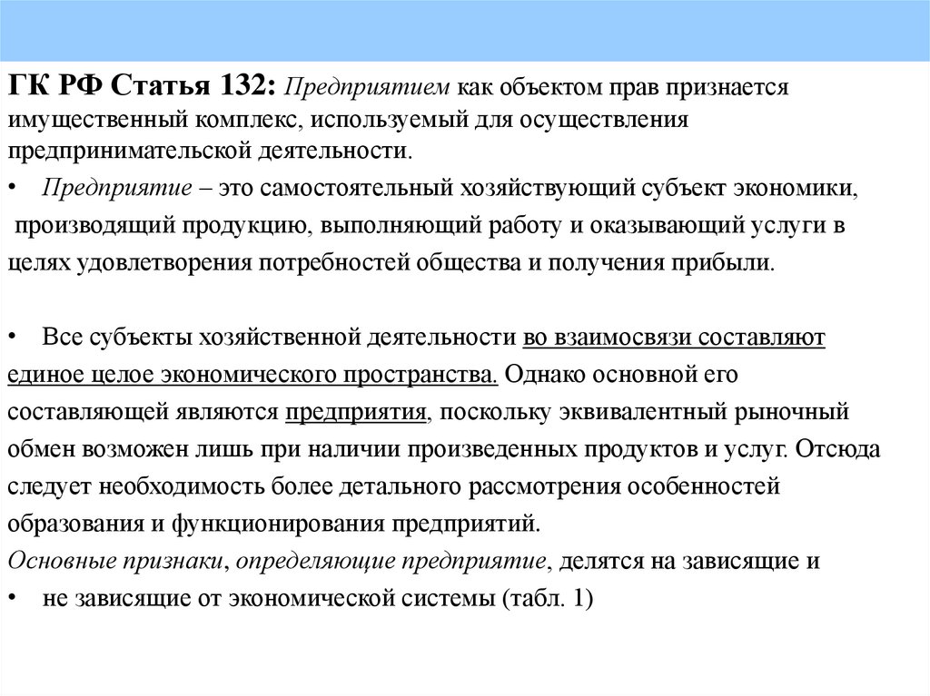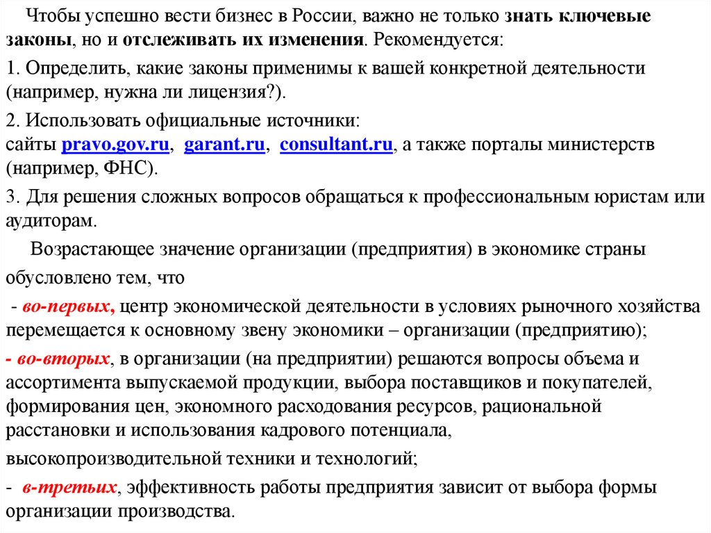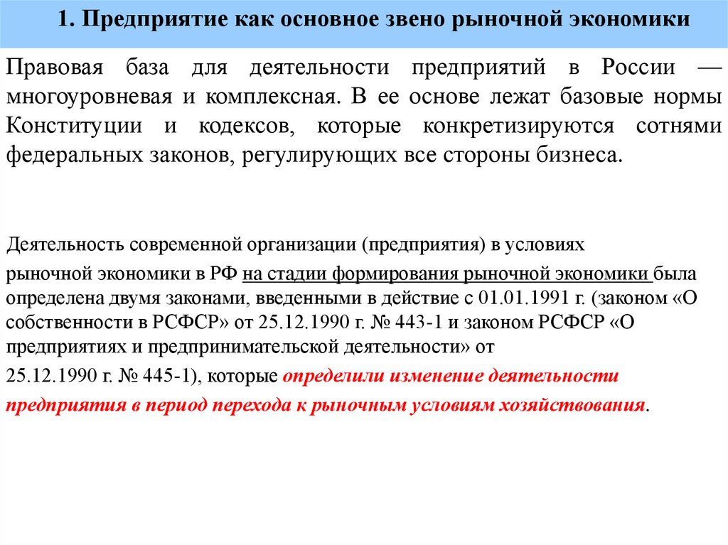 1. Предприятие как основное звено рыночной экономикиПравовая база для деятельности предприятий в России —