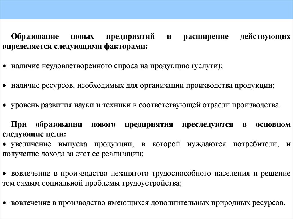 Образование новых предприятийопределяется следующими факторами: