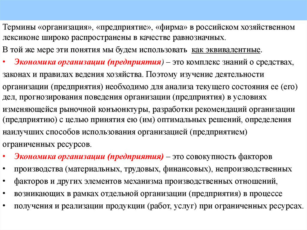 Термины «организация», «предприятие», «фирма» в российском хозяйственномлексиконе широко распространены в качестве равнозначных.