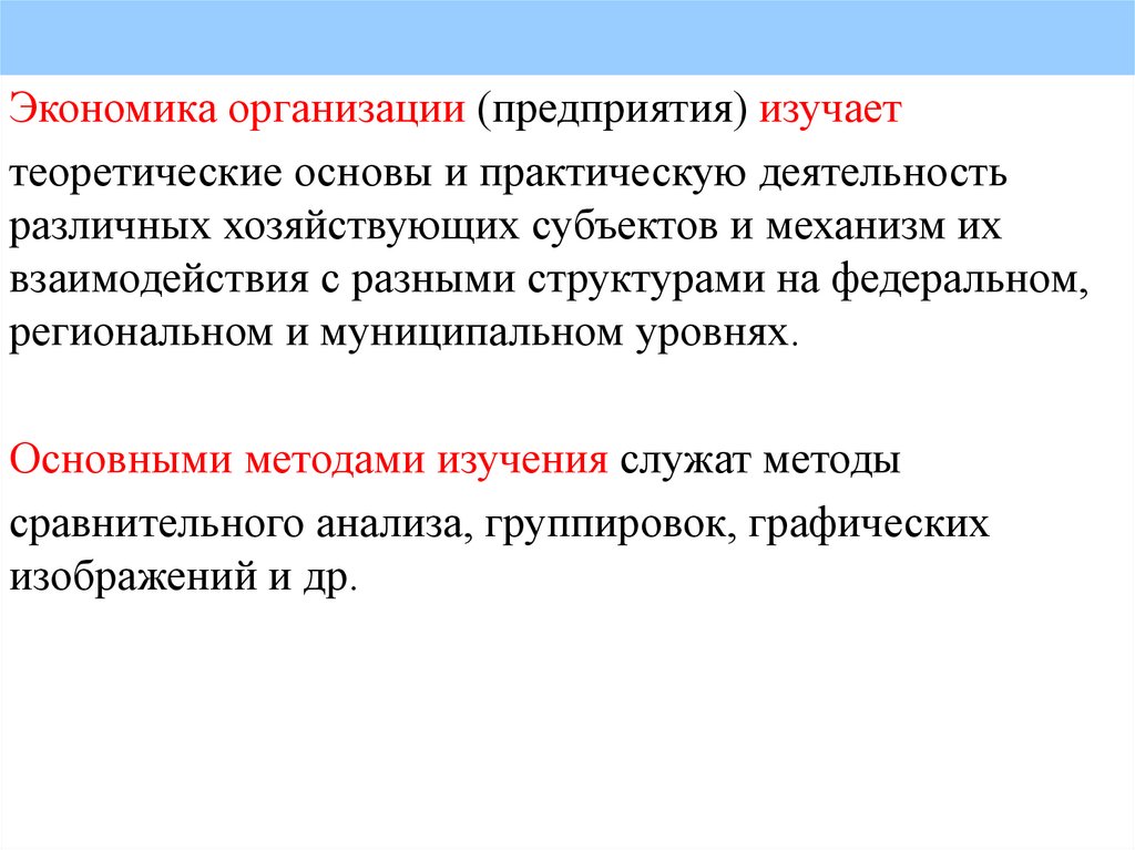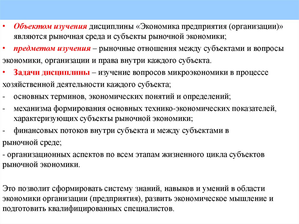 • Объектом изучения дисциплины «Экономика предприятия (организации)»являются рыночная среда и субъекты рыночной экономики;