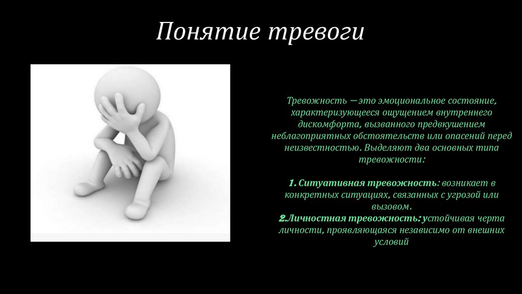 Понятие тревогиТревожность — это эмоциональное состояние,