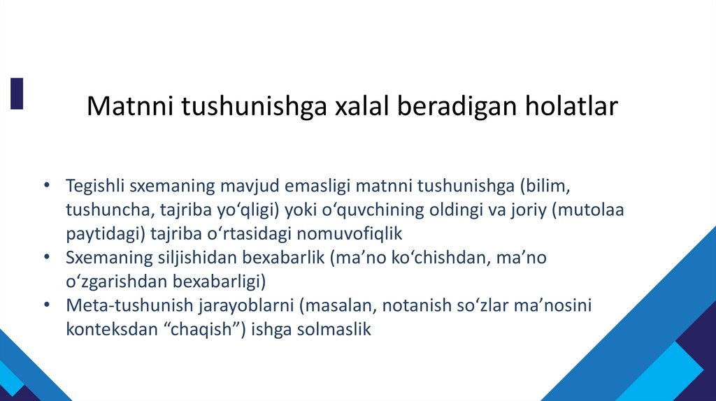 Matnni tushunishga xalal beradigan holatlar• Tegishli sxemaning mavjud emasligi matnni tushunishga (bilim,