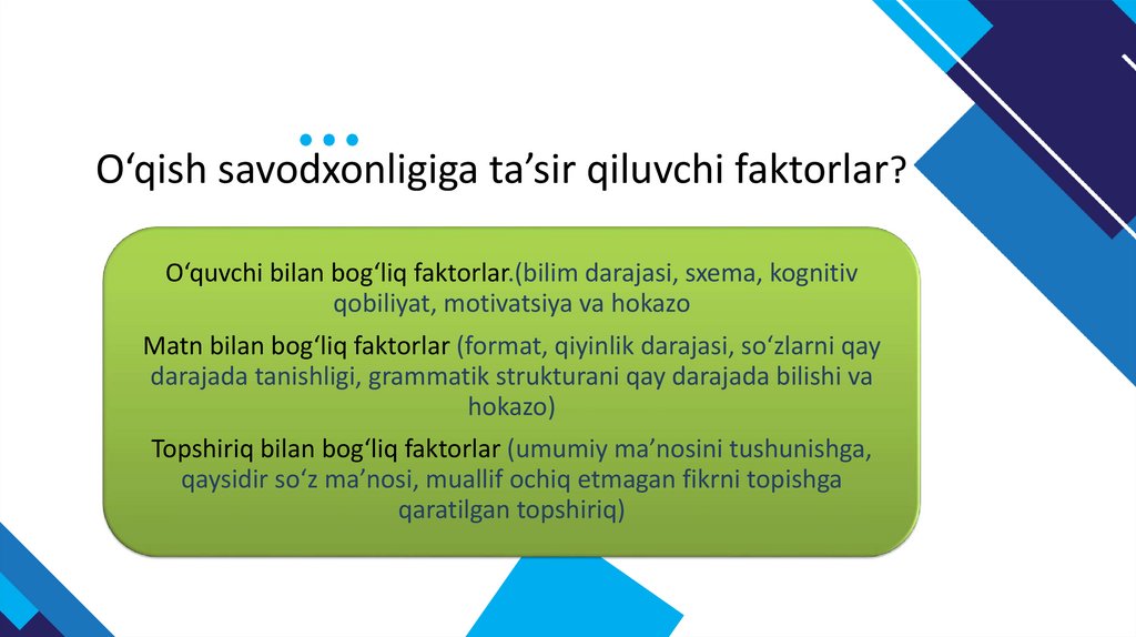 O‘qish savodxonligiga ta’sir qiluvchi faktorlar?O‘quvchi bilan bog‘liq faktorlar.(bilim darajasi, sxema, kognitiv