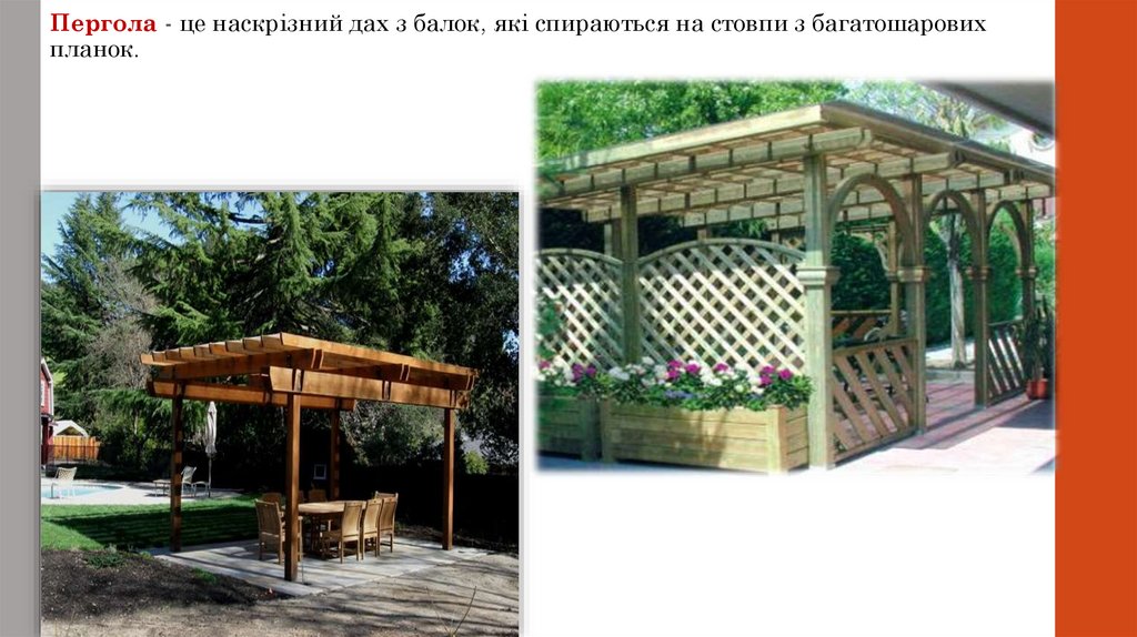 Пергола - це наскрізний дах з балок, які спираються на стовпи з багатошаровихпланок.