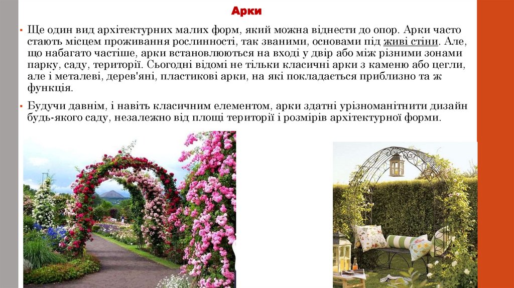 Арки▪ Ще один вид архітектурних малих форм, який можна віднести до опор. Арки часто