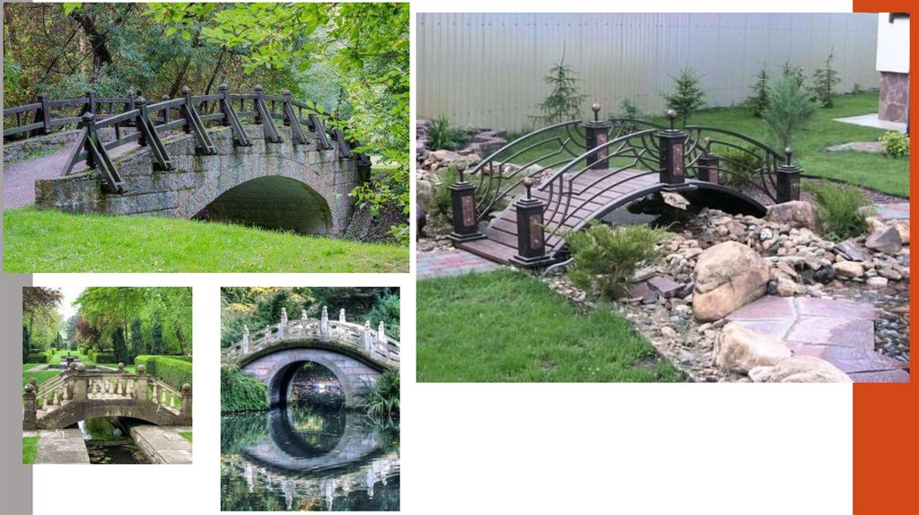 ▪ Дуже часто, поряд з містками розташовується відповідна рослинність, лавки,