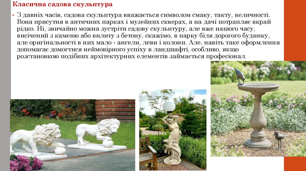 Класична садова скульптура▪ З давніх часів, садова скульптура вважається символом смаку, такту, величності.