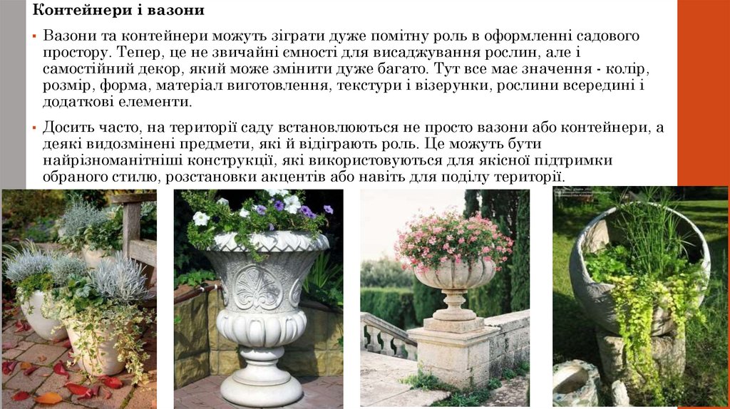Контейнери і вазони▪ Вазони та контейнери можуть зіграти дуже помітну роль в оформленні садового