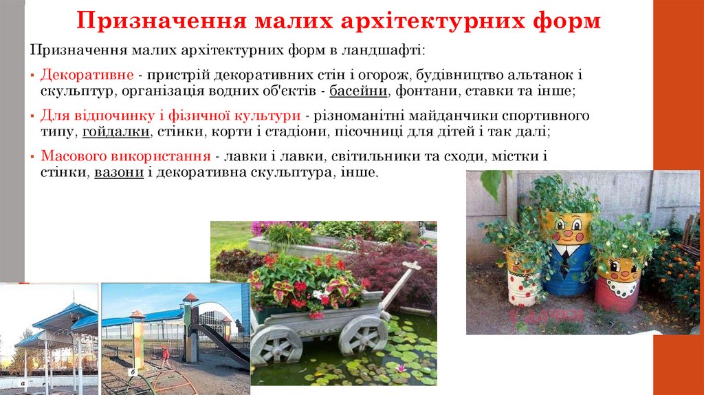 Призначення малих архітектурних формПризначення малих архітектурних форм в ландшафті: