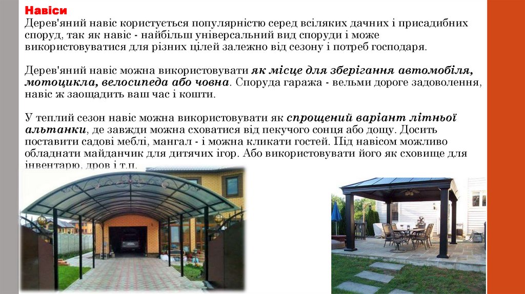 НавісиДерев'яний навіс користується популярністю серед всіляких дачних і присадибних