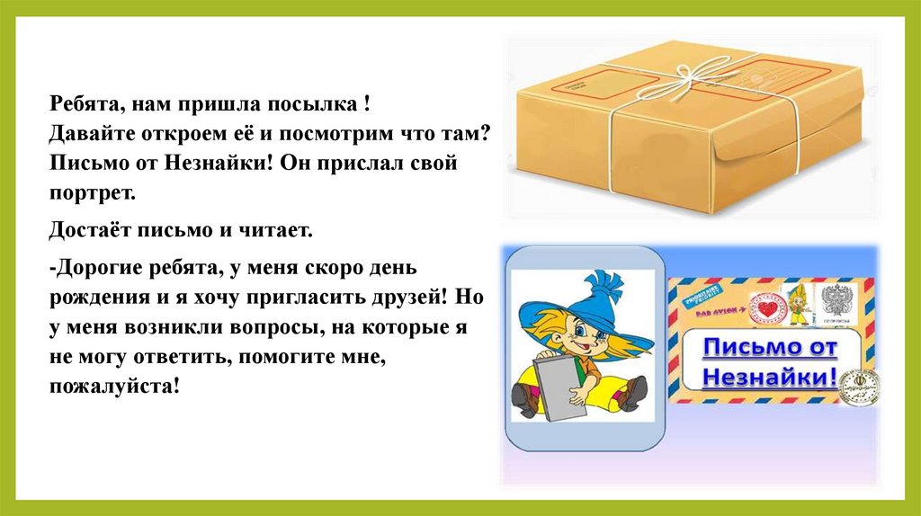 Ребята, нам пришла посылка !Давайте откроем её и посмотрим что там?