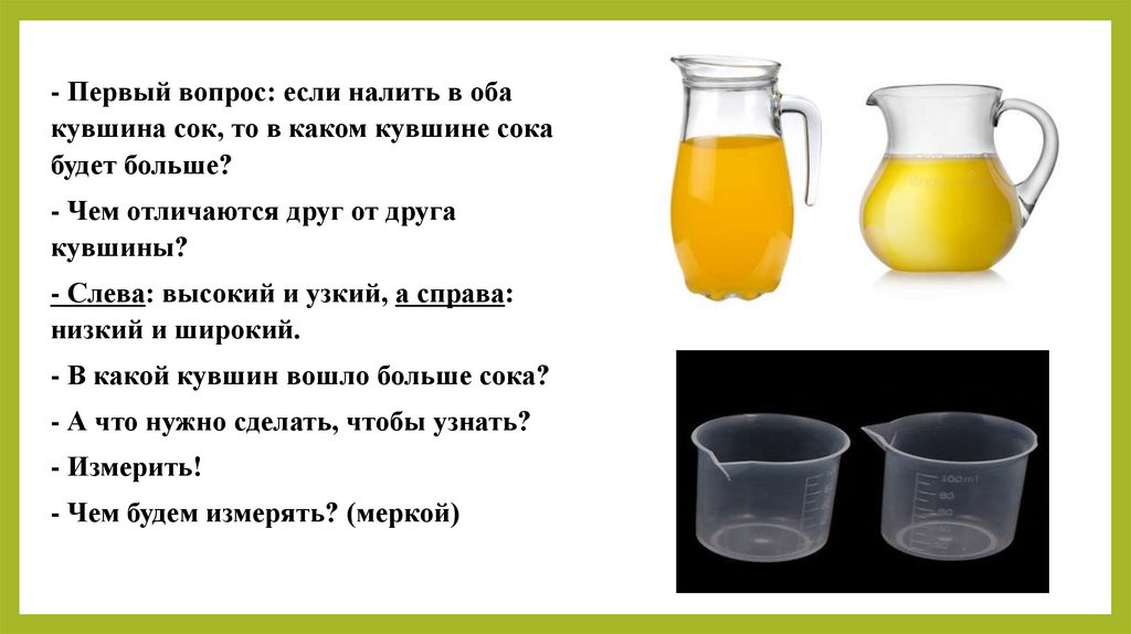 - Первый вопрос: если налить в обакувшина сок, то в каком кувшине сока