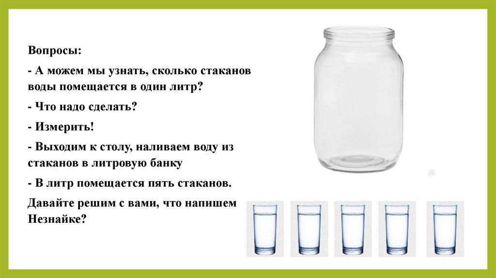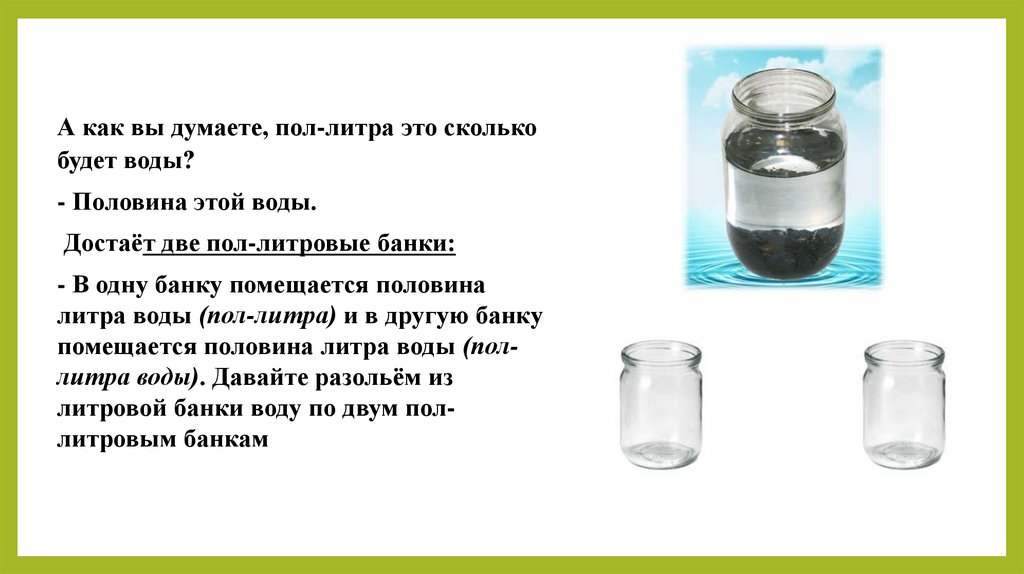 помещается половина литра воды (поллитра воды). Давайте разольём из