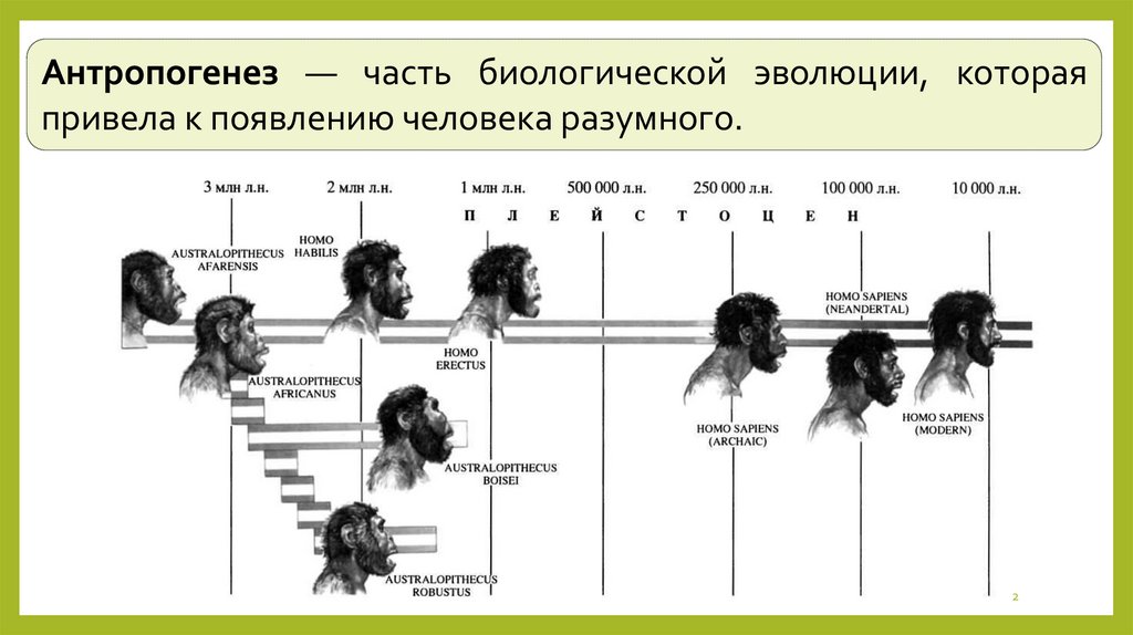 Антропогенез — часть биологической эволюции, котораяпривела к появлению человека разумного.