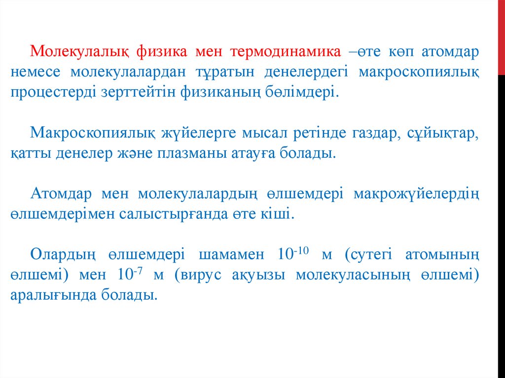 Молекулалық физика мен термодинамика –өте көп атомдарнемесе молекулалардан тұратын денелердегі макроскопиялық